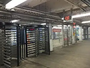 Fairmount station is a subway station in the Francisville section of North Philadelphia, Pennsylvania. It is served by SEPTA's Broad Street Line (as a local stop) and the Broad-Ridge Spur.[2] There are three separate platforms. The Broad-Ridge Spur and Broad Street Line (BSL) northbound platforms connect inside the faregates, but the BSL's southbound platform cannot be reached from the other two without exiting. Such a connection once existed; the sealed-off entrance can be seen at platform level heading south towards the end of the platform. Travelers wishing to switch between the Broad-Ridge Spur and the southbound BSL must connect at Girard. The Broad-Ridge Spur platform is shortened and can only accommodate short 2-car trains; the unused part of the platform is visible from passing trains and is covered in layers of graffiti. Fairmount station on the Broad-Ridge Spur has a full mezzanine concourse extending from Wallace Street to Ridge Avenue, now abandoned.