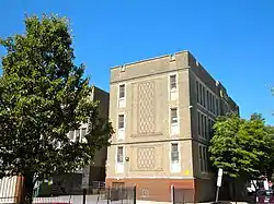 The historic school building was designed by Irwin T. Catharine and built in 1924–1925. It is a three-story, brick and limestone in the Late Gothic Revival-style. It features a projecting center two-story bay, projecting building ends with decorative brick panels, compound arched entrance, and a brick parapet.[4] The roof of the school includes a garden that is used by the local community.