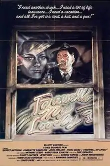 Farewell, My Lovely is a 1975 American neo-noir[3] crime thriller film directed by Dick Richards and featuring Robert Mitchum as private detective Philip Marlowe. The picture is based on Raymond Chandler's novel Farewell, My Lovely (1940), which had previously been adapted for film as Murder, My Sweet in 1944.[4] The supporting cast features Charlotte Rampling, John Ireland, Jack O'Halloran, Sylvia Miles, Harry Dean Stanton and hardcore crime novelist Jim Thompson, in his only acting role, as Charlotte Rampling's character's elderly husband Judge Grayle. Mitchum returned to the role of Marlowe three years later in the 1978 film The Big Sleep, making him the only actor to portray the character more than once in a feature film.