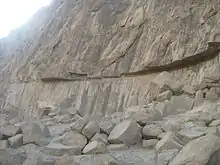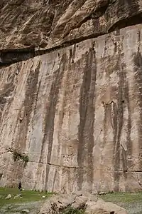 The Farhād Tarāsh (Persian: فرهاد تراش), or Tarāsh-e Farhād,[1] is a long smoothed rock surface on Mount Behistun in western Iran. Located near the famous Behistun Inscription, its height is around 30 meters and its width is around 200 meters.[1] The retaining wall in front of it is c. 150 meters.[1] The work is registered as a national heritage in Iran, and it's the biggest work of such kind in Iran.[1] The Farhād Tarāsh has sparked interest from medieval geographers including Istakhri (died 957) and Yaqut al-Hamawi (died 1229) to travelers and archaeologists in modern times.[1]