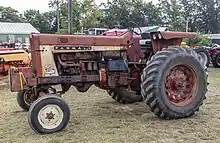 Introduced in 1963, the Farmall 806 was equipped with a C301 six-cylinder in-line engine of 301 cubic inches (4,930 cc), producing 95 horsepower (71 kW) in gasoline form. Diesel and LP gas versions were offered as well, the D361 diesel with 361-cubic-inch (5,920 cc) and 110 horsepower (82 kW). The transmission was a two-range unit with low and high ranges for a total of eight gears forward and two in reverse. A torque amplifier was offered as an option. Hydrostatic power steering was provided. Two power take-off (PTO) shafts were provided, turning at 540 and 1000 RPM. Both narrow and wide front axles were offered, with an option for a powered wide front axle.[1][2][3] The 806 was produced from 1963 to 1976.[4] About 35,000 806s were produced, ranging in price from about $7,100 for gasoline engines, to about $7,900 for diesel engines.[5]