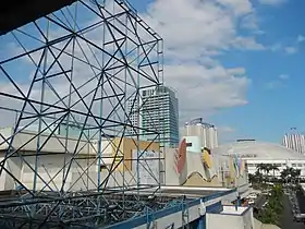 ![]() A view of the Farmers Plaza at the foreground, with the Araneta Coliseum, the Gateway Tower and the Manhattan Gardens complex at the background, from the Araneta Center–Cubao MRT station (2014) | |