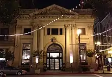 Designed in the Classical Revival style, the 1905 Farmers and Merchants Bank remains one of Southern California's finest examples of the early "temples of finance" which were popular at the turn of the century. Its two-story facade, reminiscent of a Roman temple, is punctuated by an entrance framed with Corinthian columns topped by a large triangular pediment. Built in 1905, the bank was designed by the firm of Morgan and Walls.[4]