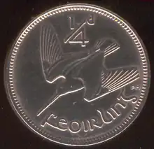 The farthing (14d) (Irish: feoirling) was the lowest value coin of the pre-decimal Irish pound, worth a quarter of a penny, 148 of a shilling or 1960 of a pound. The coin had lost much of its value through inflation long before decimalisation in 1971, and during the 1960s no farthings were produced for general circulation; those minted in 1966 were produced for collectors' sets.