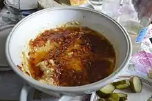Fasole bătută or fasole făcăluită (literally 'mashed beans') or icre de fasole ('roe of beans') is a bean-based paste prepared in Romania and Moldova. This dip is traditionally made by mashing boiled beans and mixing them with vegetable oil, then adding some chopped onions. Some recipes call for garlic, chili pepper, lime or lemon juice, and additional seasonings.