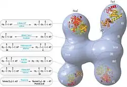The above observations seemed incompatible with the classical 'head-to-tail' model for FAS organization, and an alternative model has been proposed, predicting that the KS and MAT domains of both monomers lie closer to the center of the FAS dimer, where they can access the ACP of either subunit (see figure on the top right).[21]