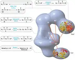 FAS 'head-to-tail' model with positions of polypeptides, three catalytic domains and their corresponding reactions, visualization by Kosi Gramatikoff.