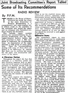 In 1941, a Joint Committee on Wireless Broadcasting was selected to conduct a review of broadcasting, particularly regarding amendments to the Australian Broadcasting Commission Act 1932 (Cth), concerning the control of the ABC and appointment of commissioners.[37] The following year, the Committee made recommendations to the government for the nationalisation of commercial radio.[38] The separation between Class A and B stations was preserved by the Broadcasting Bill of 1948.[39] That same year, the Federation established an independent Australian Broadcasting Control Board, which transferred all Post Office powers to the Federal Government.[40] The Board was responsible for supervising broadcasting in an attempt to achieve a reasonable degree of correlation between the two broadcasting services.[39] This was achieved through mandating and reviewing the provision of services, operations and equipment to uphold public interest.[41] The Board also acted to prevent a Government monopoly; ensuring the preservation of the bifurcated national and commercial radio system. The introduction of television in 1956 consolidated the Board's position; as additional officers were assigned and assumed control of the program and administrative functions of radio.[42] Their power was further cemented and protected by the Broadcasting and Television Bill 1958, which extensively addressed matters pertaining to radio and television.