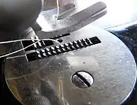 - ↑ Wilson received US patent 12116 on 19 December 1854 specifically for the four-motion feed; however, his machine that won US patent 9041 on 15 June 1852 was already using a moving feed dog whose tooth emerges from a slotted plate.