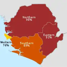 Sierra Leone has the highest prevalence of FGM in West Africa. In the MICS conducted by UNICEF, the prevalence of FGM in Sierra Leone, Gambia, Burkina Faso and Mauritania was 94%, 79%, 74%, and 72% respectively. In other countries in western Africa such as Ghana, Niger and Togo, the prevalence of FGM was less than 6%.[10] The northern region has the highest prevalence and the Western the lowest: Northern 96.3%, Eastern 91.3%, Southern 88.6%, and Western 75.6%.[9]