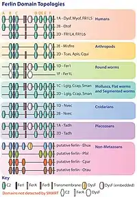 Ferlins are ancient proteins and they have been identified in protists and metazoans, and are known to exist in a range of organisms from unicellular eukaryotes to humans, suggesting primordial functions for ferlins.[7] More specifically, DysF domain and the last two C-terminal C2 domains followed by the C-terminal transmembrane domain (C2E-C2F-TM, containing approximately 489 amino acids) show a high degree of conservation. All ferlins contain several C2 domains. However, C2A may be missing in some ferlins.[7] More specifically, from six human ferlins, three of them do not contain C2A domains. Another highly conserved domain is the N-terminal C2-FerI-C2 sequence. FerI is a motif detected by Pfam, however, the function of this conserved motif is currently unknown.[7][10] Ferlins have been evolved into two groups, DysF-containing and non-DysF ferlins. Most invertebrates possess two ferlin proteins, one from each class. Most vertebrate however, have six ferlin genes, three of which DysF containing and the other three non-DysF ferlins, indicating that vertebrate ferlins are evolved and originated from the two ferlins in early metazoans. Both subgroups have been identified in early metazoans, suggesting the fundamental role associated to these proteins.[7]