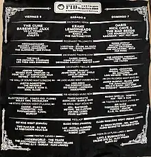 On December 23, 2008, two of the four headliners for the 2009 festival were announced as Kings of Leon and Franz Ferdinand.[8] Kings of Leon had previously played the festival in 2007, while Franz Ferdinand headlined in 2006. Tickets were made available at a discounted launch price between December 15, 2008 and January 15, 2009, with a four-day weekend pass available for 160 (£140).[9] This includes full festival entry between July 16–19, as well as camping between July 13–21.[10] On 27 January 2009, it was reported that Oasis would also be joining the line-up.[11] On 2 February 2009, NME confirmed that The Killers would be headlining the final night of the festival, with Franz Ferdinand playing Saturday 18 July and Kings of Leon playing Friday 17 July. The article also stated that Oasis would headlining the "FIBstart" event on 16 July 2009.[12] BBC News Online confirmed that Paul Weller would be playing on Friday 17 July.[13] On 26 February 2009, it was announced that The Psychedelic Furs, Friendly Fires, White Lies, The Bishops and Boys Noize had been added to the line-up,[14] with Benicàssim's official website confirming which days the bands would be playing.[15] Further line-up additions were made on 17 March 2009,[16] and again on 2 April 2009.[17] The line-up was as follows: