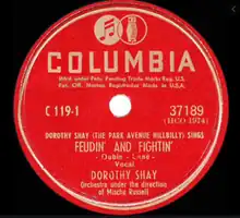 "Feudin' and Fightin" is a song written by Al Dubin and Burton Lane, sung by Dorothy Shay (billed as "The Park Avenue Hillbilly"),[1] and released in 1947 on the Columbia label (catalog no. 37189). In August 1947, it reached No. 4 on the Billboard Best Selling Retail Folk chart,[2] as well as #4 on the pop chart.[3]