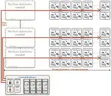 In FTTO designs there is no need for floor distributors, and no investment in cooling, power supply and security equipment (i.e. access control, fire protection, sensors, UPS) for the floor distribution room is required. Floor distribution rooms hosting technical equipments (usually measuring 6–18 m2 each) are not required and the room saved can be used alternatively.[2] Another advantage of FTTO infrastructures is their flexibility. New users, services or applications can be easily accommodated into the network. Moreover, network adjustments, upgrades and physical changes are seamlessly integrated into the existing network without operation stops. Also, FTTO installations can be realised on average by 60% quicker than their traditional counterparts. Research shows that using EEE-enabled switches can save up to 70% power consumption compared to traditional non-EEE network designs.[2]. On top of that, most advanced FTTO infrastructures help to save up to 40% TCO.[8]