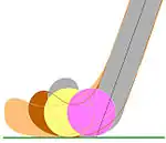 The upright forehand hitting stroke, which is commonly used when the ball is close to the feet, will seldom be made with the handle in the same plane as the ball, unless the ball is to the immediate right of the player i.e. beside or alongside his feet. (Stick shown on far right of illustration)—which is generally the case when the ball is being hit directly to the front or from left to right—with a bowed stick even this vertical handle position will present an angled head to the ball. The further away to the front of the player the ball is the greater will be the head angle presented to the ball. To deal with the problem of head presentation some players use a low 'roundhouse' style of hitting, rather than an upright style and may also employ sweep-hits or slap-hitting of the ball (the difference being the positioning of the hands, sweep hits are generally made with the hands together at the top of the stick and with the base of the stick head in contact with the ground, while slap-hits are usually made with the hands in the more spread dribbling grip and the stick head is not necessarily in contact with the ground, but it may be), either sweep or slap type strokes give greater control over the angle of the face of the stick as it makes contact with the ball and are often the preferred strokes when passing the ball over longer distances (over shorter distances—less than 20 m—a push stroke is often preferred).