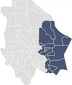 Under the 2005 districting scheme, Chihuahua's Fifth District covers the municipalities of Aldama, Allende, Aquiles Serdán, Camargo, Coronado, Coyame del Sotol, Delicias, Jiménez, Julimes, La Cruz, López, Manuel Benavides, Meoqui, Ojinaga, Rosales, San Francisco de Conchos and Saucillo.[1]