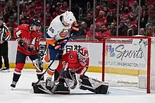 New York Islanders forward Oliver Wahlstrom jostle for position in front of the net against Washington Capitals' goalie Vítek Vaněček. Fights may occur to protect "defenceless" goalies.