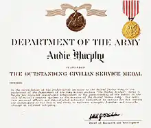 - ↑ Dept. of the Treasury. "Medal of Honor with Audie Murphy". U.S. National Archives and Records Administration ARC Identifier 5727074. Retrieved 10 October 2013.