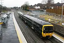 The line through Filton Abbey Wood was due to have been electrified by 2017 as part of the Great Western Main Line electrification project, however this has been postponed indefinitely.[46][47][48] The Cross Country Route, the Bristol to Exeter line and the Heart of Wessex Line were not set to be electrified, so services at Filton Abbey Wood would still have been provided by diesel trains; however many "Sprinter" units have been replaced by Class 165 and 166 "Turbo" units.[49][50] The group Friends of Suburban Bristol Railways supports the electrification continuing beyond the main lines,[51][52] as does MP for Weston-super-Mare John Penrose.[53][54] The electrification scheme also included the four-tracking of the line through Filton to allow more services between Bristol Parkway and Bristol Temple Meads and to separate fast inter-city services from local stopping services, which was completed in November 2018.[55][56][57] A fourth platform has been added in November 2018 as part of the project.[58][59]