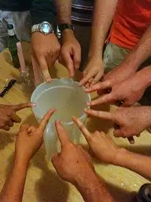 Fingers or finger spoof is a drinking game where players guess the number of participating players who will keep their finger on a cup at the end of a countdown. A correct guess eliminates the player from the game and ensures they will not have to drink the cup. The last person in the game loses and must consume the cup contents. The cup could be a pint glass, pitcher, or other vessel (large enough for all players to put one finger on the rim) that is filled with a sip or small sample of all players' own beverage prior to the start of the game.[1]