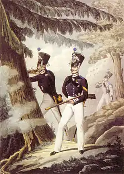Of these three regiments, the first to start operations was the 3rd, Viborg regiment, in 1812. Its first assignment was to undertake guard duty in Saint Petersburg between 31 March 1813 and 31 August 1814, while the majority of Russian Army was tied in Western and Central Europe in the battles against Napoleon.[4] By the summer 1813, two other regiments had also been formed, the first consisting of the battalions in Turku and Hämeenlinna and the second of battalions in Heinola and Kuopio. This military force of some thousand men, however, had little significance to the Finnish defense. The force suffered from lack of artillery, cavalry and technical branches. Furthermore, only the unit in Vyborg was in service continuously, others gathered according to the former allotment system annually for 4-week training and the officers in preceding 6-week meetings.[5] Two of the regiments were downgraded to infantry regiments, while the third held its more demanding "rifle" designation.[6]