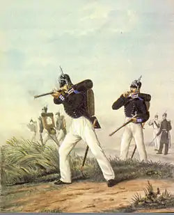 By imperial order in March 1827, the Finnish military force was re-organised into six rifle battalions. The name of the Helsinki Battalion was changed to the Finnish Training Rifle Battalion and its size was increased by 100 men to 500. After two months, recruitment in the other two units was forbidden and they were disbanded in 1830. After this, the Helsinki Battalion was the only remainder of the military force formed in 1812.[8] Until the end of the 1870s, the battalion was recruited from volunteer Finns. Its enlisted personnel consisted of the Finnish lower classes: farm-workers, labourers, journeymen, freeholders' sons and crofters' sons. The discipline was harsh and physical punishments were widely used.[9]