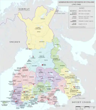 ![]() Finnish advance to Eastern Karelia during the Continuation War. The military administration extended further north. Red area inside the gray borders was re-annexed directly to Finland on 9 December 1941.[1] | |||||||||