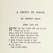 "Fire and Ice" is a short poem by Robert Frost that discusses the end of the world, likening the elemental force of fire with the emotion of desire, and ice with hate. It was first published in December 1920 in Harper's Magazine[1] and was later published in Frost's 1923 Pulitzer Prize-winning book New Hampshire. "Fire and Ice" is one of Frost's best-known and most anthologized poems.[2]