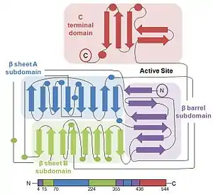 The protein structure of firefly luciferase consists of two compact domains: the N-terminal domain and the C-terminal domain. The N-terminal domain is composed of two β-sheets in an αβαβα structure and a β barrel. The two β-sheets stack on top of each other, with the β-barrel covering the end of the sheets.[2]
