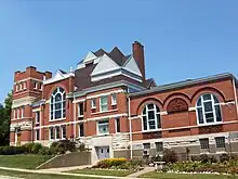 First Baptist is a late 19th-century interpretation of the Romanesque style inspired by Henry Hobson Richardson known as Richardsonian Romanesque. It combines late Victorian polychrome surface areas with a shingle-style roofline treatment. The sanctuary is nearly square in plan and features a very high hipped roof with blind dormers, corner pavilions, and a three-stage tower. The structure was built of red brick and rough stone. It incorporates wide, rounded arch windows in its massive form.[6] They are accompanied by smaller rectangular windows that are grouped in twos and threes. Period stained glass fills the window openings. The corner tower originally had a spire on top. It was removed in the 1950s after it was damaged in a storm.[7] A classroom wing is attached to the sanctuary.