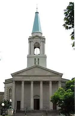 The congregation was organized in 1843 by James and John Moses. After its first baptismal service in nearby First Creek, the church had 46 members, including 20 African-Americans. The church organized its first Sunday School in 1845. The first building was constructed on Gay Street in 1844. The second building was built at the same location in 1887.[2] The third (and present) building was completed in 1923 at the Main Street location, three years after Dr. Frederick Fernando Brown became pastor. This architecturally-significant structure, noteworthy for its Neoclassical design and octagonal sanctuary, was designed by Dougherty & Gardner of Nashville, Tennessee, and is modeled on St Martin-in-the-Fields of London. The exterior of the church sanctuary is sheathed in marble, although the adjoining education space is brick.[2] The congregation is moderate,[3] and is member of the Cooperative Baptist Fellowship,[4] a mainline denomination in the South.
