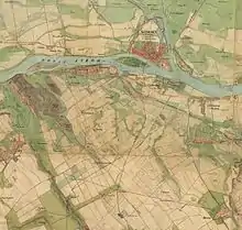 After occupying the 7. and 8. trenches, Kiss's brigade turned west, and occupied Monostor (in German Sandberg), probably together with the trenches nr. 4., 5., 6.,[28] capturing the enemy siege artillery, destroying the Hohenlohe battalion which was defending it, and capturing 4 officers and 350 men.[30] However, after this, the Austrian 2. jäger battalion attacked the Kiss brigade, recapturing the trenches, but the Honvéd battalions, coming from the Hadi-Island (today Erzsébet sziget/Alžbetin Ostrov/Elisabeth island on the Southern part of the city, today part of Slovakia), led by General Richard Guyon,[lower-alpha 2]