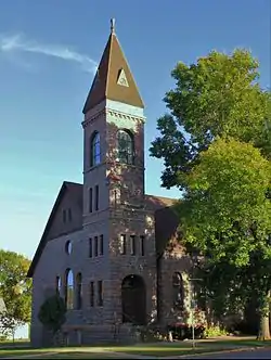 Rock Rapids United Methodist Church, formerly known as First Methodist Church, is located in Rock Rapids, Iowa, United States. The church building is significant for the use of blue-gray and red granite used in its construction.[2] It was designed by Sioux Falls, South Dakota architect Joseph Schwartz utilizing the Richardsonian Romanesque style. Completed in 1896, it is the second church building for a congregation founded in the 1870s. The blue-gray granite quarried near Sioux Falls is the main building material, and it is laid in a random ashlar pattern. The red granite was acquired from the receiver of a bankrupt packing plant which had begun, but did not complete, a new stone building. It is used for the trim, especially in the voussoirs of alternating colors. The building also features a tall corner bell tower. The pipe organ was ordered from the Hinners Organ Company of Pekin, Illinois in January 1905 at a cost of $1,960 (equivalent to $64,000 in 2022).[3][4] An addition was added to the south side of the church in 1966. The church was added to the National Register of Historic Places in 1978.[1]