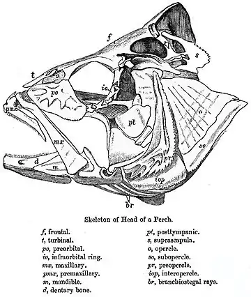 The head of a fish includes the snout, from the eye to the forward most point of the upper jaw, the operculum or gill cover (absent in sharks and jawless fish), and the cheek, which extends from eye to preopercle. The operculum and preopercle may or may not have spines. In sharks and some primitive bony fish, a spiracle, a small extra gill opening, is found behind each eye.[1]