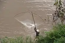 The fishing industry in the land-locked country of Laos is a major source of sustenance and food security to its people dwelling near rivers, reservoirs and ponds. Apart from wild capture fisheries, which is a major component of fish production, aquaculture and stocking are significant developments in the country. Historically, fishing activity was recorded in writings on the gate and walls of the Wat Xieng Thong in Luang Prabang dated 1560.[1] For many Laotians, freshwater fish are the principal source of protein.[2] The percentage of people involved in regular fishing activity is very small, only near major rivers or reservoirs, as for most of the fishers it is a part-time activity.[3]