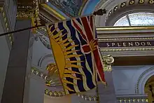The four wavy white and three wavy blue lines symbolize the province's location between the Pacific Ocean and the Rocky Mountains. The setting sun represents the fact that British Columbia is Canada's westernmost province. The image of the continuously rising sun refers to the provincial motto splendor sine occasu (Latin for 'splendour without diminishment"[3][4][5]')—suggesting the idea that the sun never sets (on the British Empire). The Union Flag on top reflects the province's British heritage, while the crown in the centre represents British Columbia becoming a Crown colony and achieving responsible government. The flag has an aspect ratio of 3:5.[6]