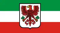 The civil flag of the city of Gorzów Wielkopolski is divided into three equally-sized horizontal stripes. They are, from top to bottom, green, white, and red. The colours were based on those of the city coat of arms. The proportions of the flag have the aspect ratio of its height to its wight equal 6:11. The state flag depicts the coat of arms of the city, placed in the centre of the civil flag. The coat of arms consists of the white Iberian style escutcheon (shield) with square top and rounded base. In its centre is placed a red eagle with its head facing left, and spread wings, and a red tongue put out. It has yellow (golden) beak, and clows at its legs. The eagle holds a green clover in each of its legs.[1][2]