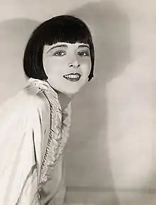 The flapper signaled the transition from the pre-World War I feminine ideals, such as the Gibson Girl, to the post-war modern era. She acted out the changes that were taking place “in fashion, sex, social awareness, and politics.”[15] Basinger describes the iconic image of the flapper: “flat-chested and angular, big-eyed and lively, and with her hair cut short, very short, straight across the bottom and topped off with bangs” - the distinctive "Dutch Boy bob".[16]