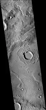 Flammarion is an impact crater in the Syrtis Major quadrangle on Mars at 25.2 ° N and 48.3 ° E. It is 173.0 km in diameter. Its name was approved in 1973, and refers to French astronomer Camille Flammarion.[1] There may have been a lake in the crater in the past because a channel is present on the northern rim, and sedimentary layers are present within the crater.