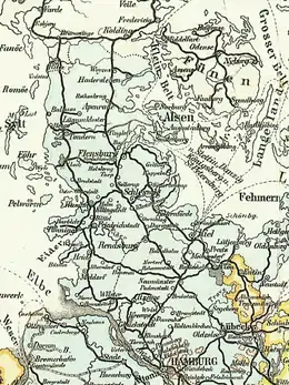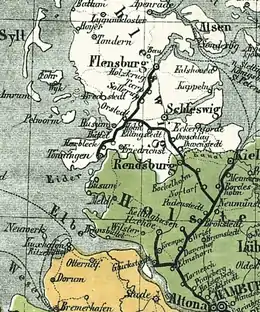 ![]() Flensburg–Husum–Tönning line with spur to Rendsburg north of the former German-Danish border (extract from German rail map of 1861) |