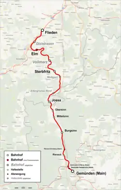 The route runs from Fulda, initially on the same tracks as the line via Hanau to Frankfurt am Main, the Kinzig Valley line. At Flieden it leaves the Kinzig Valley line and runs through the Spessart and Rhön foothills through the closed stations of Elm and Vollmerz, followed by Sterbfritz station, which remains open to passengers, and the abandoned stations of Mottgers and Altengronau Nord before reaching Jossa in the Sinn Valley.