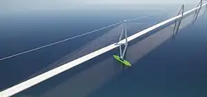 A Floating cable-stayed bridge is a type of cable-stayed bridge where the towers float on tension-leg submerged material, tethered to the seabed for buoyancy. No floating cable-stayed bridge has been made or planned yet, a floating suspension bridge has been planned in Norway. This bridge could be more stable horizontally across the bridge than floating suspension bridges, the lateral movement force from the wind and current in the water is a problem trying to be resolved by placing the tethered cables at different angles from the floating platform to the seabed.[1][2]