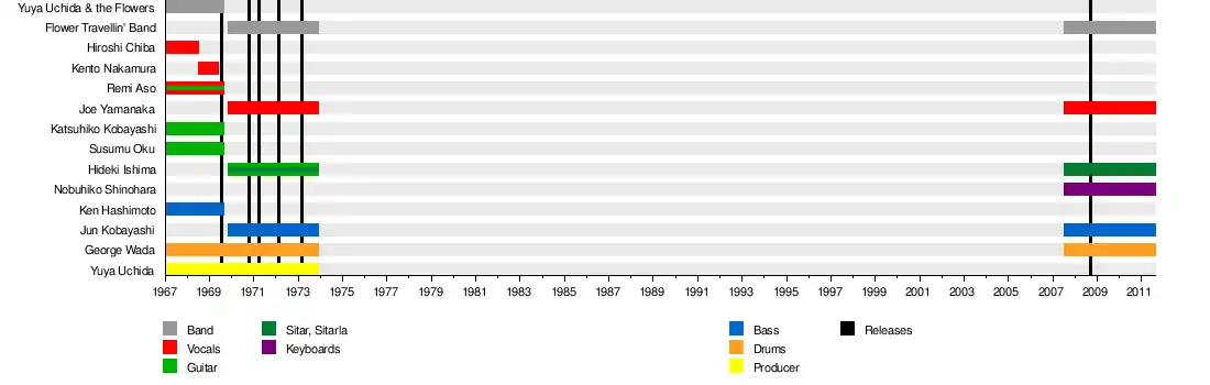 Flower Travellin' Band (フラワー・トラベリン・バンド, Furawā Toraberin Bando) was a Japanese rock band that was formed in 1967. They were connected to Japan's counterculture movement and noted for their mixture of early heavy metal with psychedelic and progressive rock. They received wide acclaim from critics but failed to achieve commercial success and separated in 1973 to pursue individual careers.[1] The band reunited in late 2007, but permanently disbanded after the 2011 death of vocalist Joe Yamanaka.