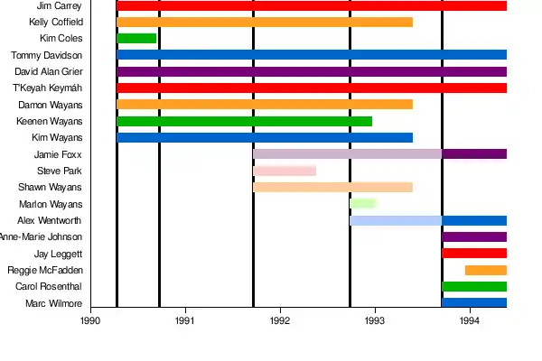 Cast members came and went during the run of In Living Color (Fox-TV, 1990–1994). Some earlier cast members continued to appear in later seasons so later casts also include some previous years' cast members.