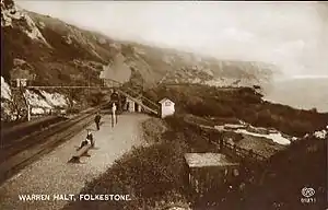 The station was first opened by the South Eastern Railway in 1886 which installed a bridge over the Main Line leading to a gate on to The Warren from which the public could picnic and enjoy the dramatic scenery in the area; a zig-zag path led down the East Cliff to the station.[2] The Halt enjoyed, however, a brief existence, closing after the Summer in the face of threats by Lord Radnor who felt that his land was being trespassed upon.[3] There is also a suggestion that the station had not been formally authorised by the Board of Trade which, upon discovering its existence, refused to grant consent.[4]