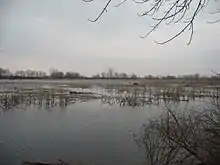 Muskrat houses and cattails are visible in Sunken Island Lake, part of Sunken Grove WMA, 4 miles (6 km) northwest of Fonda.