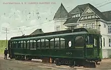 After World War I, ridership started to decline in both the steam and electric divisions. The steam line acquired gas-powered cars to take patrons to the Sacandaga Park in the early 1920s and FJ&G management concluded by 1932 that reequipping the passenger car fleet on the electric line would reverse matters even though the Depression had been underway since 1930. In 1932 at considerable expense, five lightweight, fast, comfortable, and power-efficient Brill Bullet interurban cars were purchased from J. G. Brill and Company of Philadelphia.[1][2] The bright orange FJ&G interurbans ran hourly into Schenectady where they looped around Crescent Park. Ridership did initially improve with the operation of the new Bullet cars, but increased auto ownership, improved paved roads, the deepening of the Depression, and a further decline in the glove business brought on another ridership reversal. The first sale of the unique Bullet cars by Brill had been to the Philadelphia and Western Railroad. The second and last sale was to the FJ&G. One of the FJ&G's five Bullet cars has made its way (via Salt Lake City's Bamberger Railway) to the Orange Empire Railway Museum in Perris, California, where it is being restored. It still has its bright orange FJ&G paint. As late as the 1950s, FJ&G RR still made a daily passenger run to the village of Broadalbin, a single wood-clad 1880s vintage coach—usually with zero to two passengers—pushed or dragged by a Diesel switching locomotive. It was said that this was done to maintain the railroad's charter.