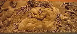Goujon was one of the first French sculptors to draw inspiration from the sculpture of ancient Rome, particularly the bas-relief sculptures on Roman sarcophagi. The nymph and triton on one of the fountain panels (see illustration) resembled a Roman sarcophagus in Grottaferrata, which was on display when Goujon was in Rome, and which had been the subject of several 16th century artists. The Triton’s hair resembled that in an ancient statue of The River Tiber, which had been discovered in Rome in 1512.