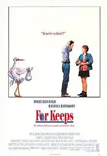 For Keeps is a 1988 American coming of age comedy drama film starring Molly Ringwald and Randall Batinkoff as Darcy and Stan, two high school seniors in love. Complications ensue when Darcy becomes pregnant just before graduation and decides to keep her baby. This movie is noted for being Ringwald's final "teen" movie, and is cited as one of her most mature performances, particularly in a scene where Darcy is suffering from postpartum depression after the birth of her child.[2]