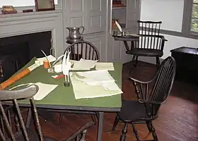 Washington wrote many letters to Congress explaining the poor predicament that his troops were in during his stay at the Ford Mansion. His place of work was in the private study, which was located on the first floor of the house.[17] Washington's aides-de-camp worked in the parlor, which became the military office. These included Alexander Hamilton, Robert H. Harrison, Tench Tilghman, Richard Meade, and James McHenry.[18] The only record of Washington's stay at the mansion was a letter from Richard Meade to Mrs. Ford, dated July 26, 1780: